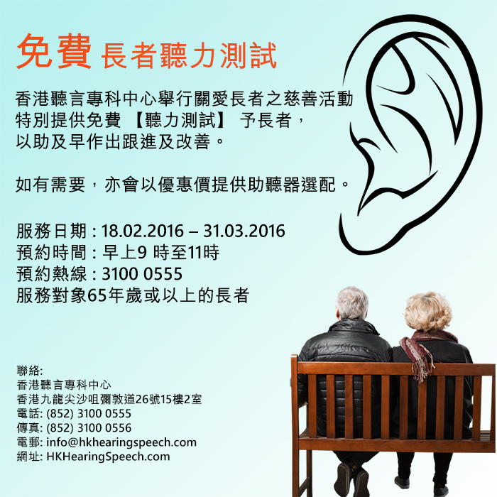 香港聽言專科中心 - 免費長者聽力測試 本診所由2016年2月18日起至2016年3月31日,舉行關愛長者之慈善活動,特別提供免費 【聽力測試】 予長者,名額100名,以助及早作出跟進及改善。如有需要,亦會以優惠價提供助聽器選配。請即登記預約。 服務日期 : 18.02.2016 – 31.03.2016 預約時間 : 早上9 時至11時 預約熱線:31000555 服務對象65年歲或以上的長者